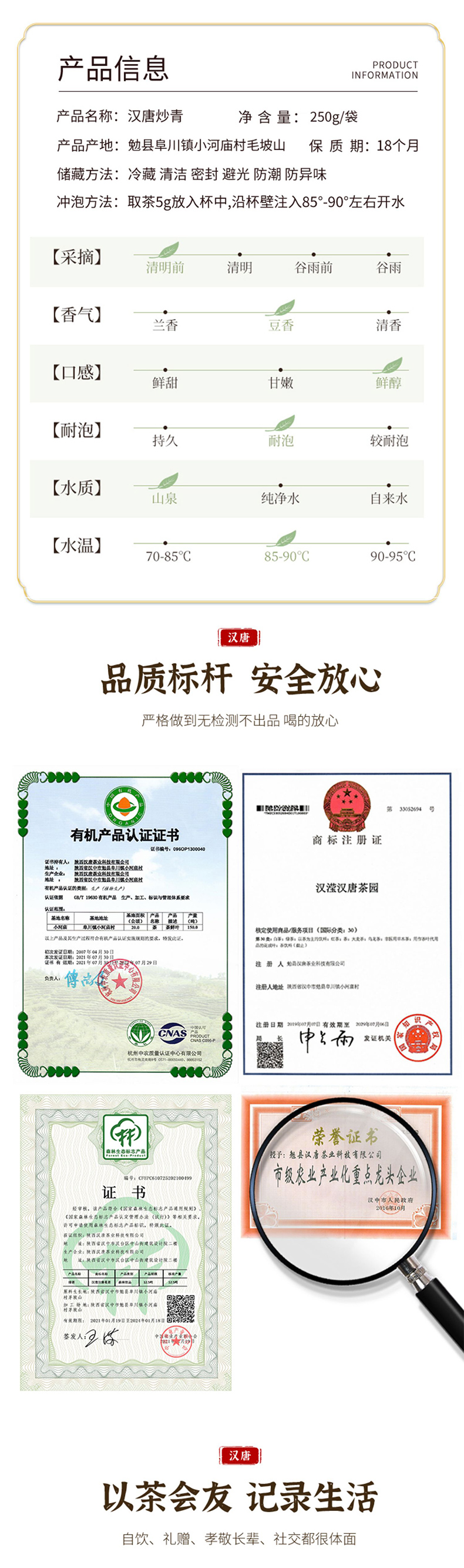 汉中炒青是绿茶,产于陕西秦岭山脉南麓,陕西地区土壤含有丰富的锌硒,生产出的茶叶内含物质高,富含锌硒。制成的汉中炒青外形卷曲、身骨重实,冲泡后的茶汤嫩绿明亮,香高味长,滋味浓厚,耐冲泡。产于秦岭以南,汉中绿茶以“香高、味浓、耐泡、形美、保健”的特点闻名,汉中炒青属于未发酵茶,茶叶中所含的茶多酚、咖啡碱、叶绿素等天然物质。