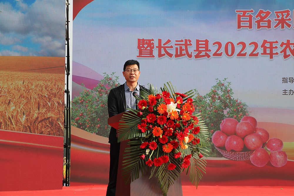 中国农产品市场协会会长张玉香视频致辞。王高锋现场致辞。程晓东介绍安排了百名采购商陕西果区行活动。中农为农(北京)科技服务有限公司总经理蔡立民代表采购商进行了发言。赵广柱、何锐分别为采购商代表、网红主播代表授旗。赵广柱宣布百名采购商陕西果区行暨长武县2022年农民丰收节系列活动启动。