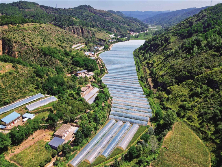 航拍延安市安塞区沿河湾镇方家河村设施农业基地。当地产业依托良好的生态环境,实现了绿色发展。