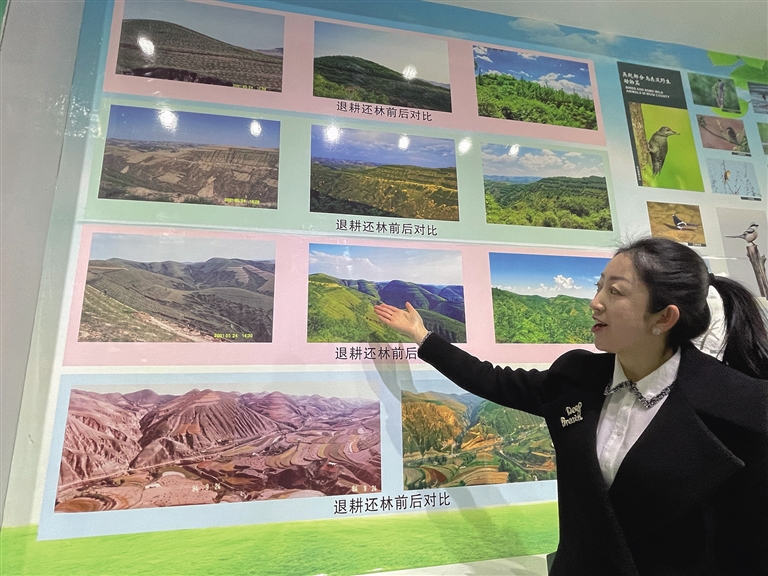 3月7日,在延安市吴起县退耕还林展览馆,讲解员杭佳妮正在对着照片讲述吴起县退耕还林前后的变化。
