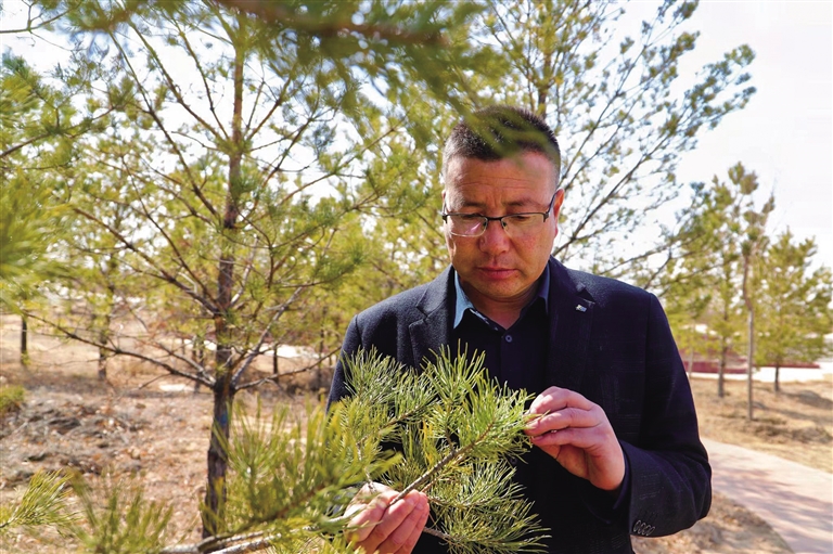 3月10日,在榆林市榆阳区小纪汗十万亩樟子松基地,小纪汗林场党支部副书记王建东查看沙地柏是否有病虫害。