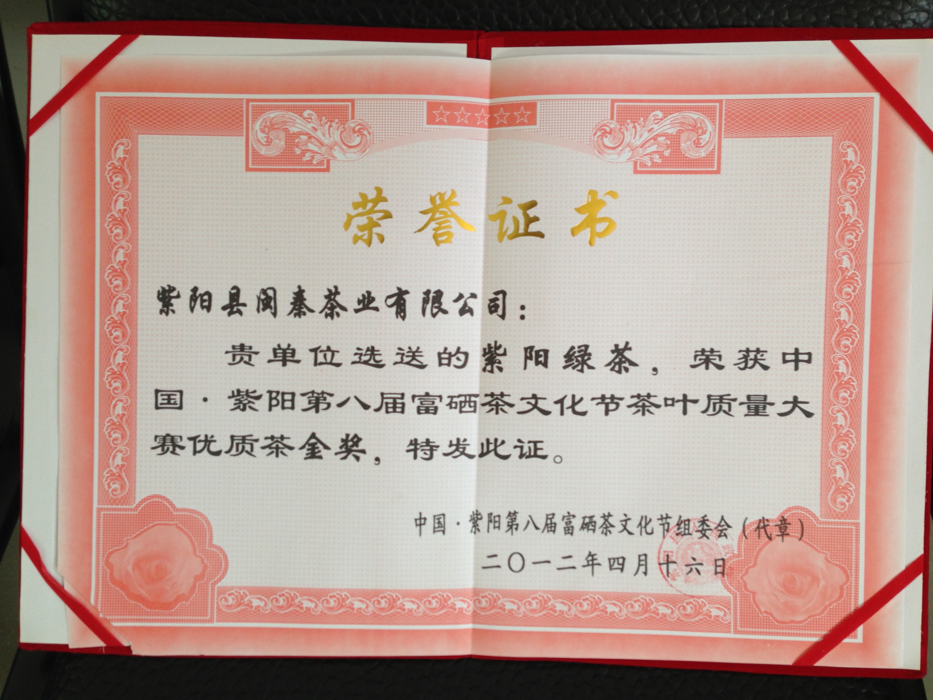 2013年公司董事长陈瑛丽荣获“中国富硒行业特别贡献奖”,“闽秦牌”紫阳富硒红茶被授予中国富硒行业金奖产品,同时在2013年紫阳县茶叶质量评比(红茶)中荣获一等奖,并被评为第二届中国富硒生态产业发展高峰论坛暨中国富硒行业十大富硒榜金奖产品。