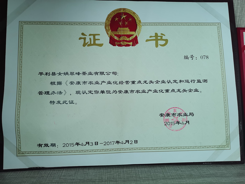 平利县女娲翠峰茶业有限公司位于陕西省平利县洛河镇,是一家茶叶、红茶生产加工、销售于一体的民营企业。公司成立于2007年,现有加工厂占地面积4000平方米,有绿茶清洁化生产线、红茶清洁化生产线各一条。公司本着建基地、强管理、创品牌、提效益的发展思路,不断扩大茶饮产业规模,树立企业形象。坚持诚信经营的宗旨,抢抓发展机遇,拓展销售市场,开发女娲翠峰系列名优茶产品,取得了较好的经济效益。目前公司已有高效茶园2000亩,下联加工厂15家、联营茶叶基地4000亩。主要生产女娲银峰、女娲翠峰、女娲云雾、女娲毛尖、炒青等各种名优茶200吨,红茶茶20吨,年生产经营产值2000余万元,是平利县现有示范引导和辐射带动的茶饮品牌企业,也是平利洛河镇万亩茶园的龙头企业,公司2012年被县委县政府列为县级现代农业产业园区,2015年被认定为安康市农业产业化重点龙头企业,2017年被认定为市级茶叶现代农业园区,计划2021年创省级现代农业产业园区,公司发展前景十分广阔,是全县的示范茶饮企业之一。