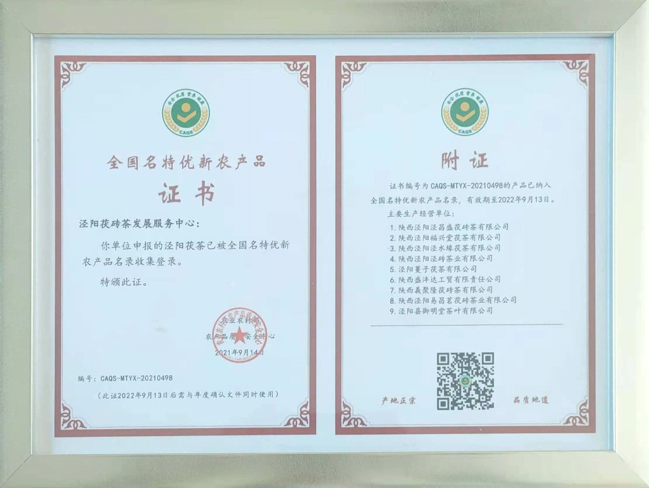 10.2019年10月,在泾阳茯砖茶发展服务中心和西北农林科技大学泾阳茯茶研发中心联合举办的2019年泾阳茯茶制作评比大赛中荣获“一等奖”。