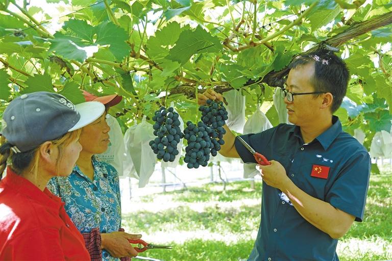 立秋过后,正是葡萄成熟之季。走进陕西石鼓现代农业园,一串串紫色葡萄饱满剔透,在阳光照射下显得格外诱人。“乡村匠人”——农业产业技术服务队的党员技术骨干正在田间地头开展教学,为农民群众传授实用技术,提升农村劳动力技能素质。“以前果子结得越多越好,现在不同了,产量低些不打紧,品质提上去卖价高,这样收入才能增加。”刘家村村民杨仕军说,他主动向“乡村匠人”学技术后,种植葡萄收入翻了几番。