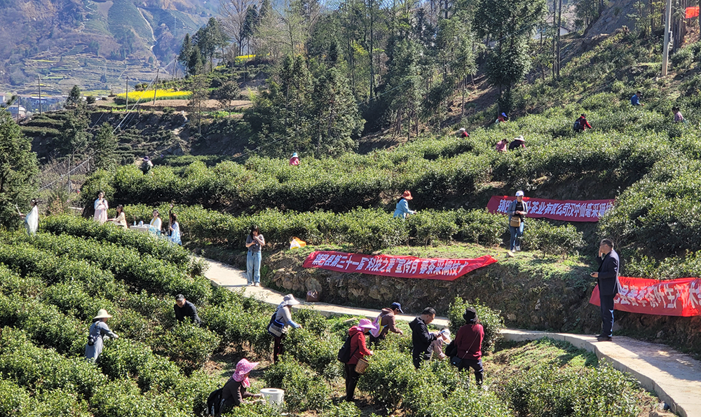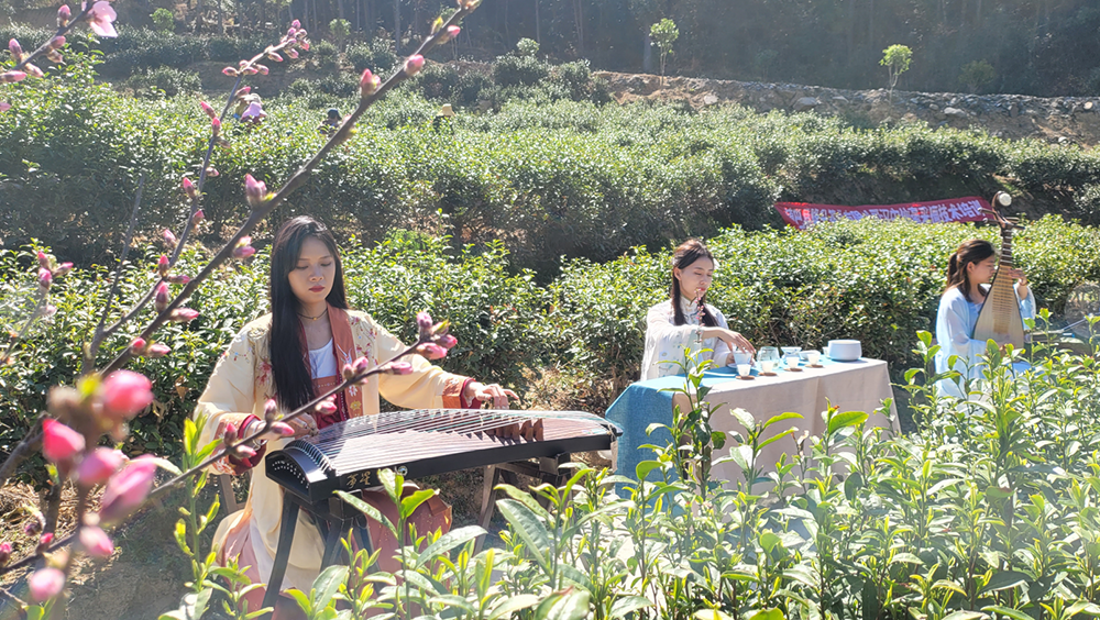 经冬蕴藏,逢春萌发,茶园吐露新绿,茶香漫山飘溢,这时进入了茶叶采摘的最好时节。一曲筝音茶禅意,一杯香茗敬茶人,一弦琵琶觅知音。茶园里,茶叶清香萦绕园间,前来体验采摘的游客一边欣赏着茶艺表演,一边品尝着高山有机绿茶。