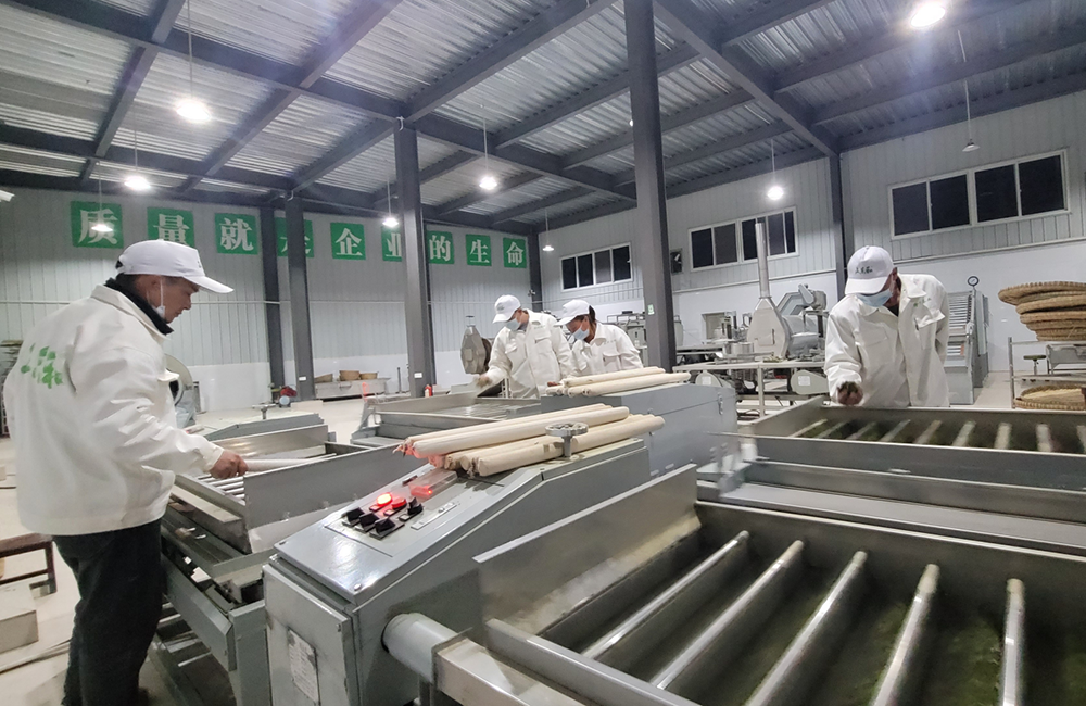 与此同时,茶场车间内喧嚣不断,采摘下来的茶叶放置摊青6-8小时后投入加工生产。伴着机器轰鸣,开始了杀青、理条等十几道加工程序,工作人员在各个生产线上有条不紊地忙活着。