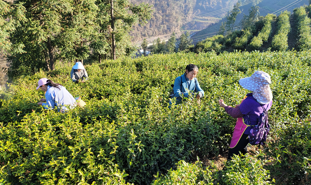 只见茶农穿梭在茶树丛间,腰挎茶篓,熟练地舞动双手,任凭指尖在叶片中翻转腾挪,目光在枝丫间拣选芽头叶尖,色泽嫩绿的芽茶,过程如行云流水,俨然一幅生机盎然的采茶图景。