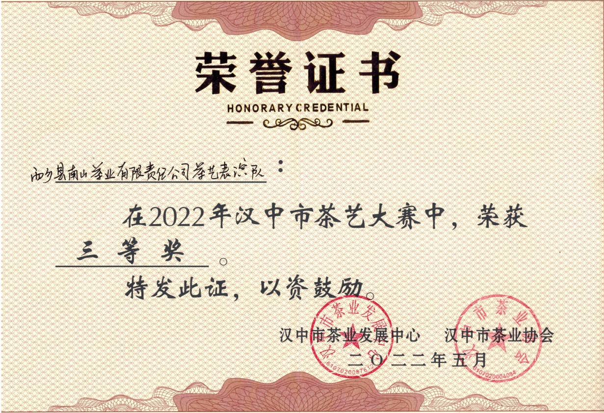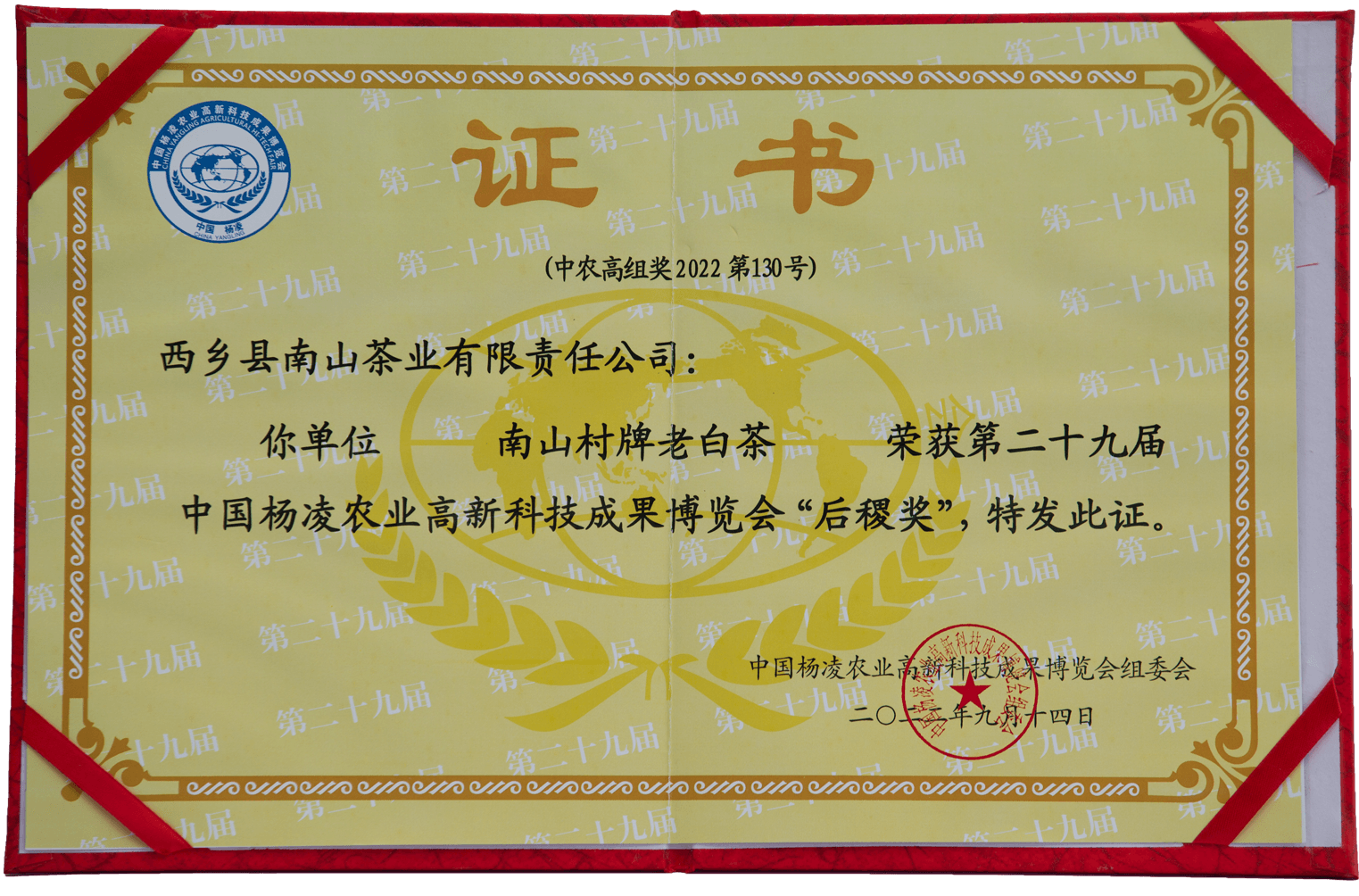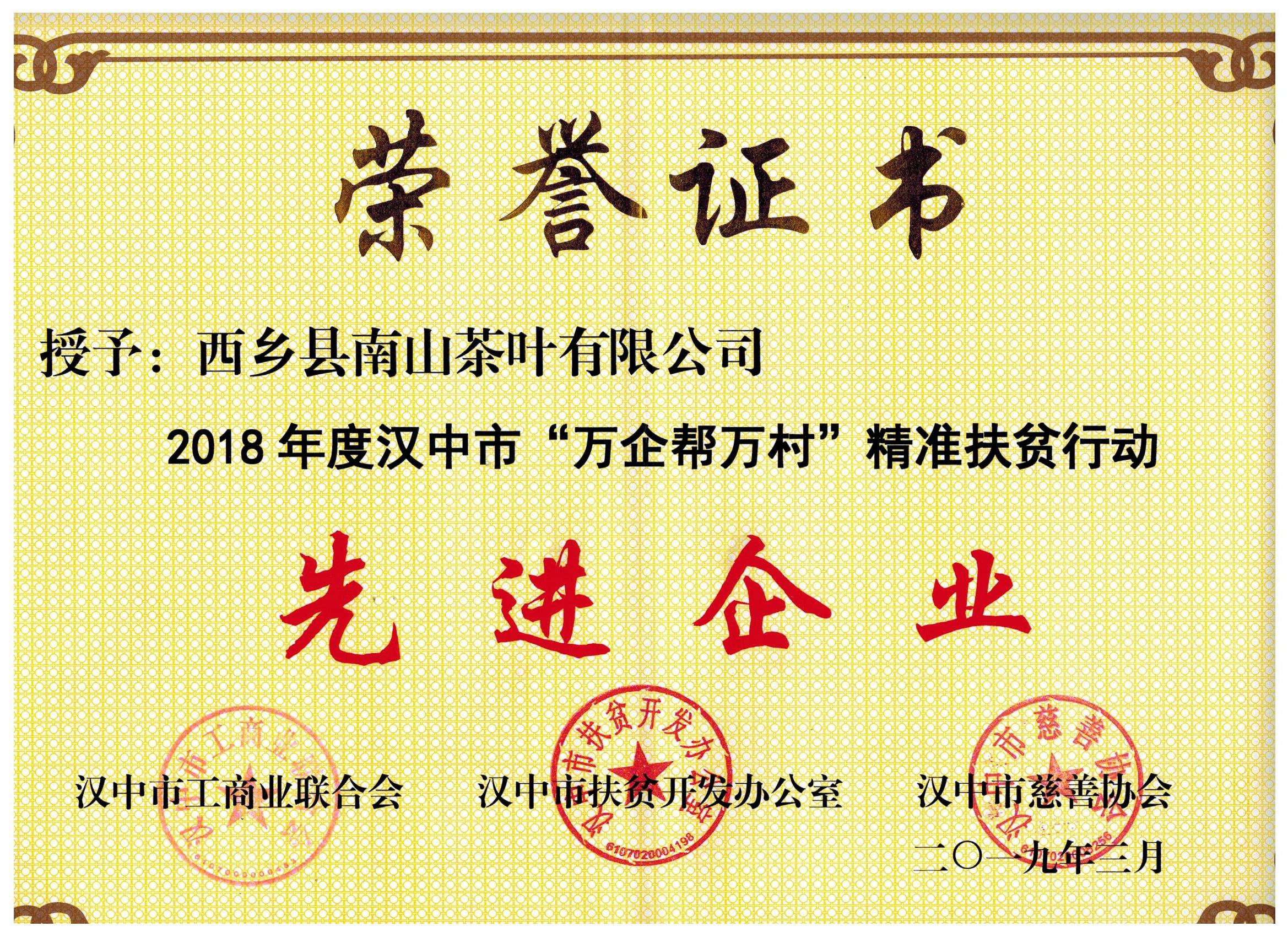 公司先后通过了ISO9001:2015国际质量管理体系认证、HACCP认证、SC认证、有机认证等多项认证。公司已成为陕西省茶叶协会常务理事单位、陕西省农业产业化重点龙头企业,先后荣获陕西省高新技术企业、陕西省茶行业“十佳特别贡献企业”、陕西行业之星企业、卓越绩效导入认证企业和知识产权管理体系认证企业、汉中市万企帮万村精准扶贫行动先进企业和西乡县首届县长质量奖等荣誉称号。“南山村”商标被授予“陕西好商标”;公司生产的“南山村”牌汉中仙毫被授予陕西省名牌产品称号;“南山村”牌系列产品多次在省级以上茶博会上荣获30多项金奖。